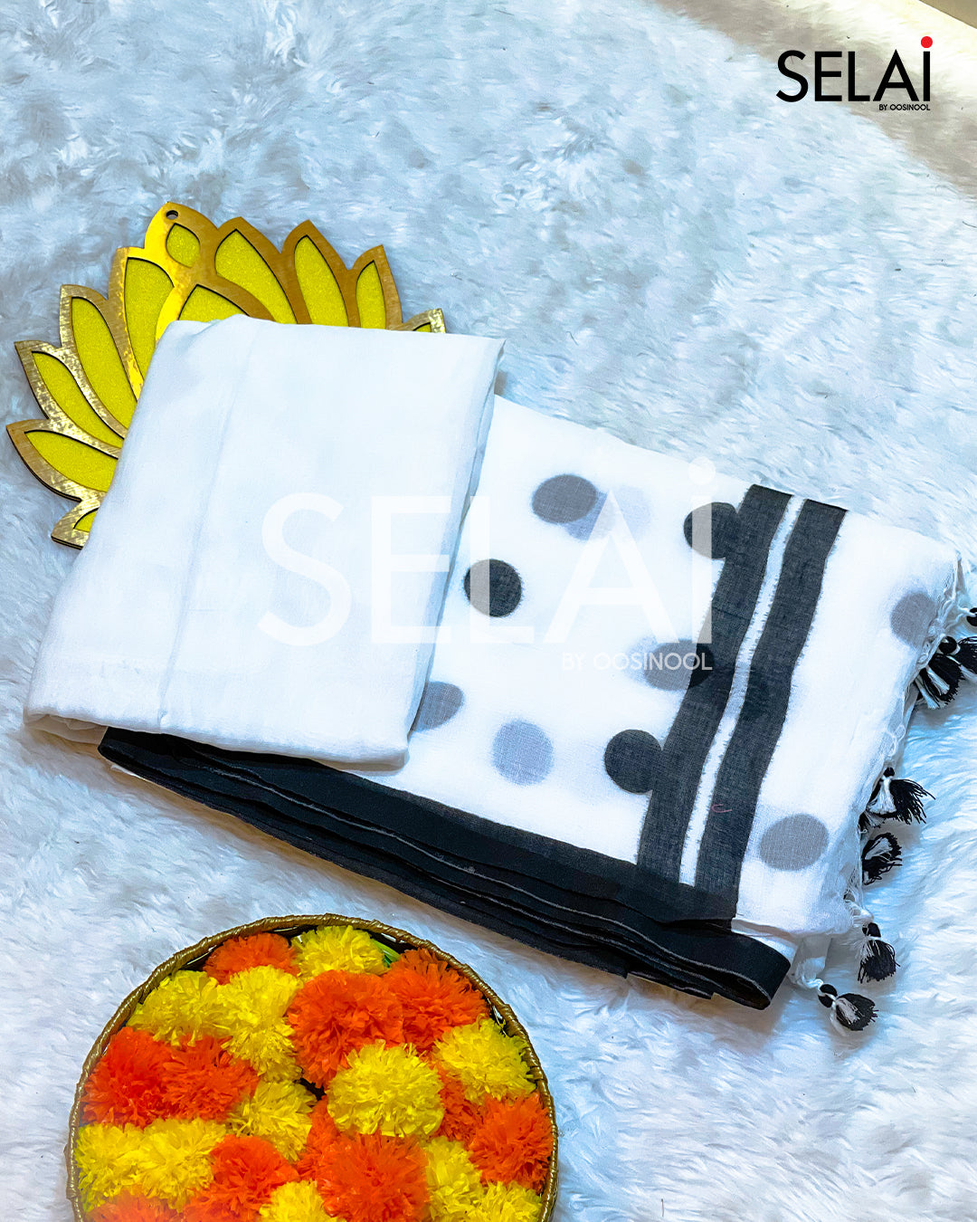 Polka Dot Mulmul Cotton Saree (White with Black)