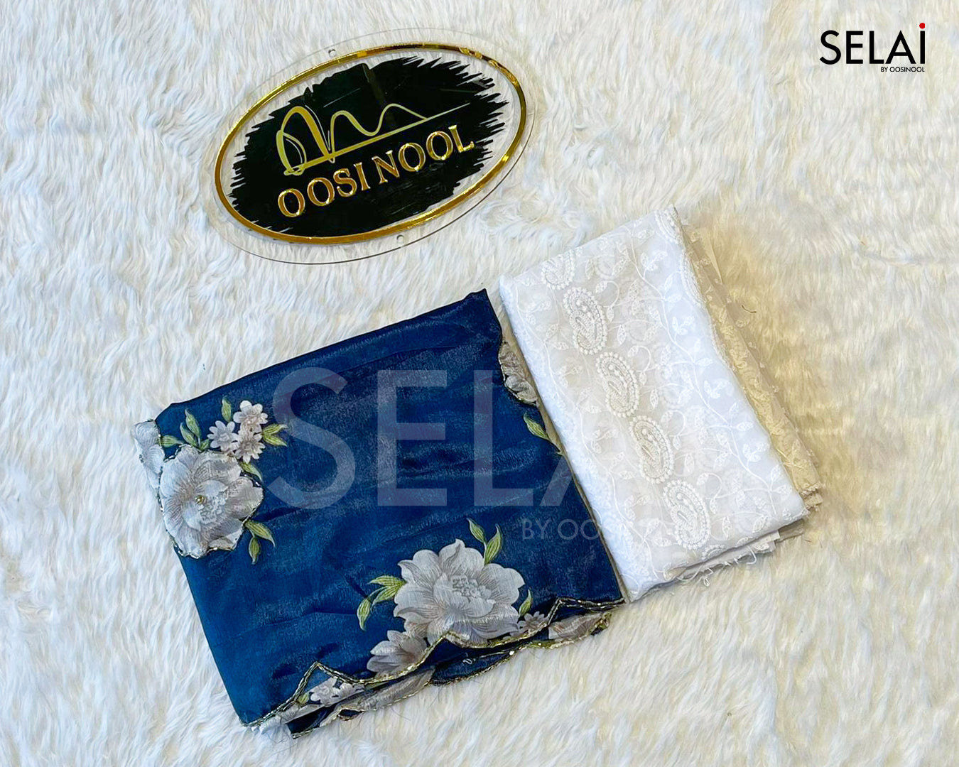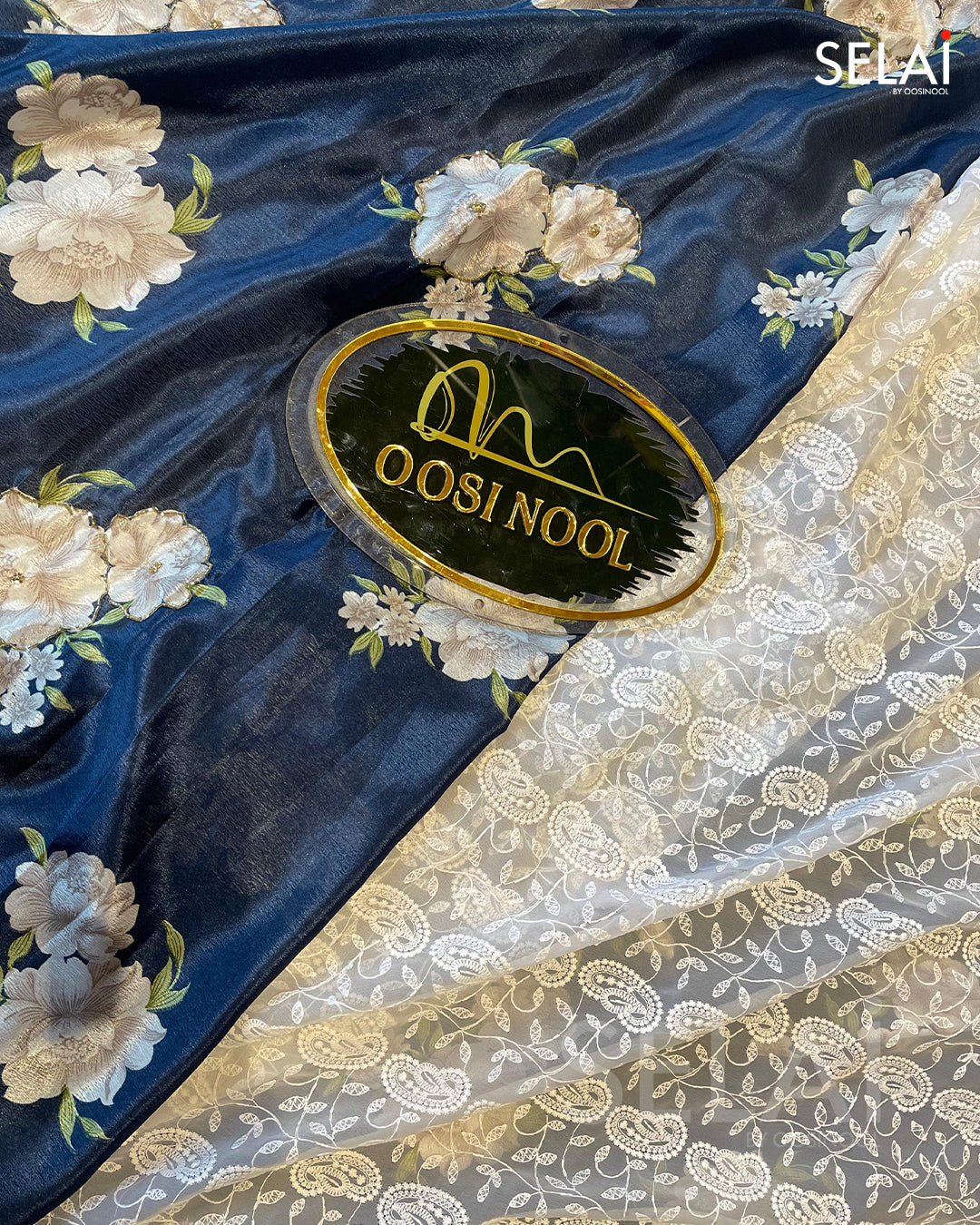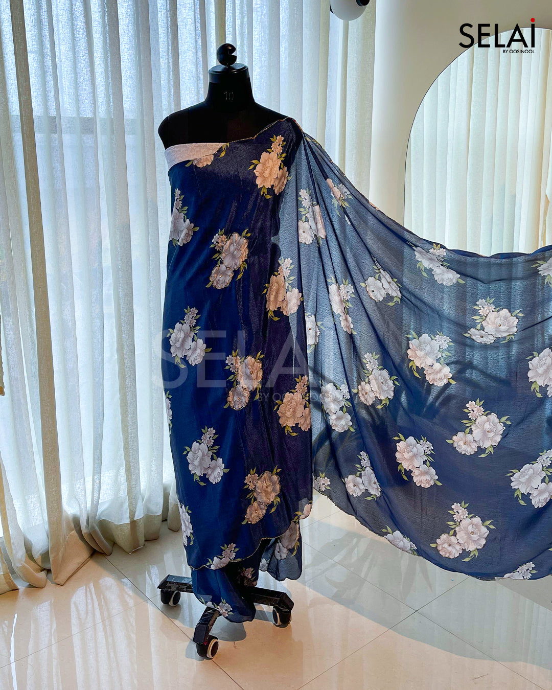 A graceful blend of elegance and detail, this georgette saree with a rose print is adorned with delicate cut dana embroidery that adds a subtle shimmer with every movement. The lightweight georgette fabric ensures a flattering drape, making it ideal for festive occasions, parties, or evening gatherings.