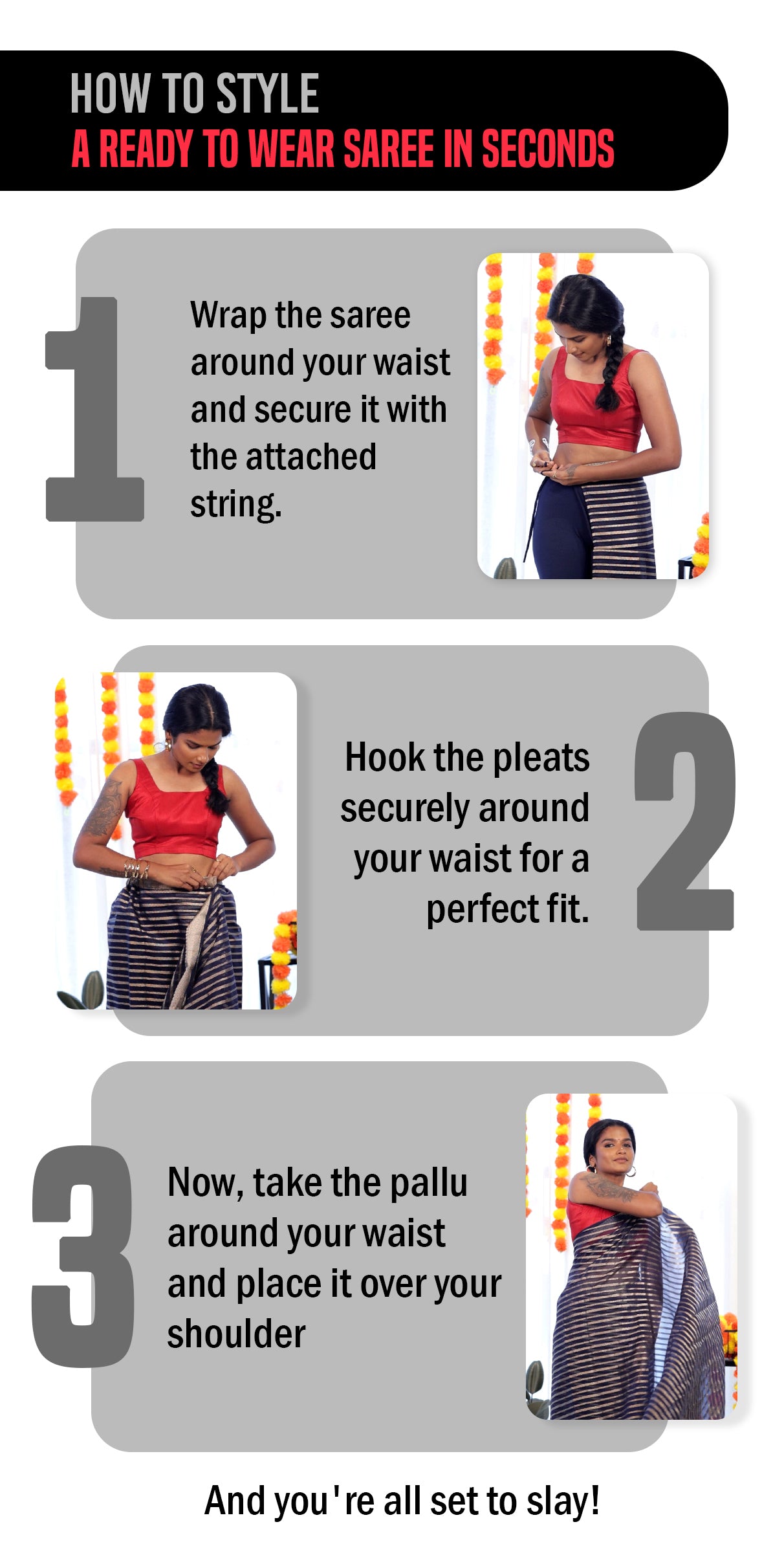 Get this saree stitched as Ready-to-Wear, designed for women on the go. With an elasticated waist and a secure hook closure, it lets you drape effortlessly in just 10 seconds, perfect for ease and elegance.