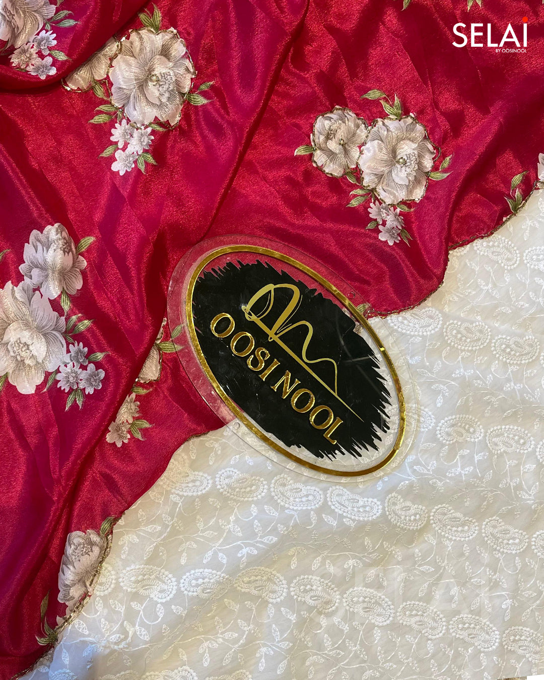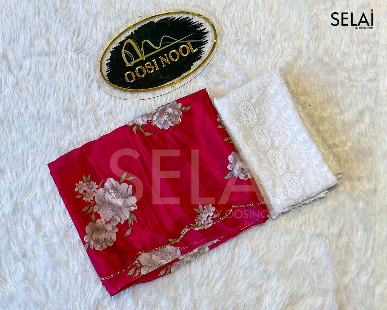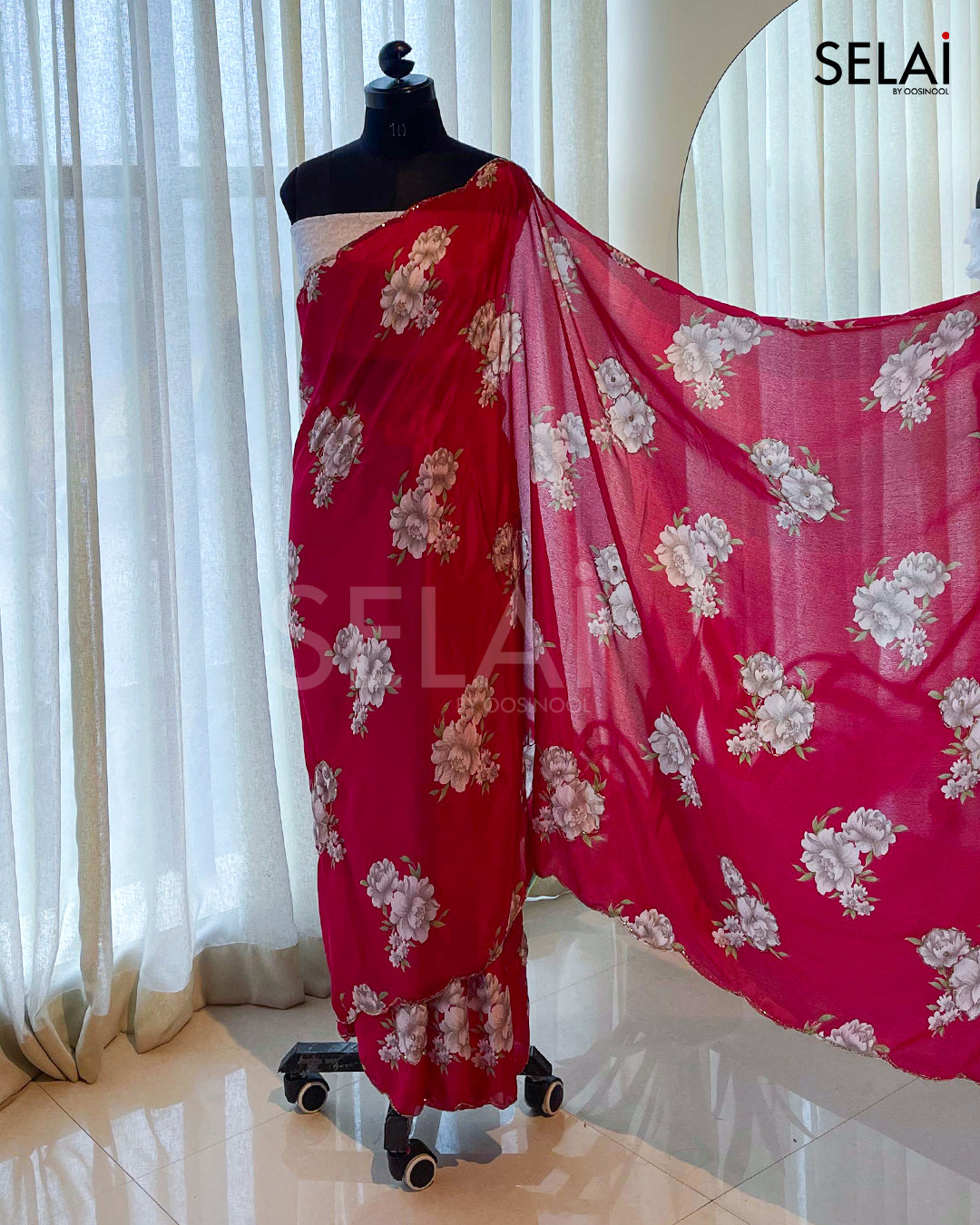 A graceful blend of elegance and detail, this georgette saree with a rose print is adorned with delicate cut dana embroidery that adds a subtle shimmer with every movement. The lightweight georgette fabric ensures a flattering drape, making it ideal for festive occasions, parties, or evening gatherings.