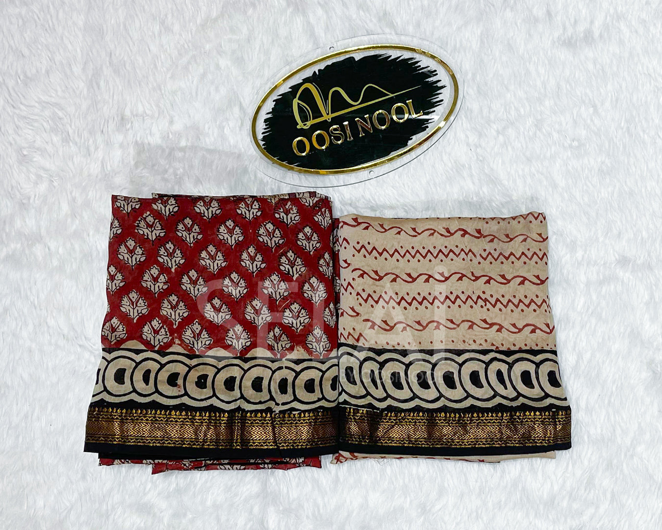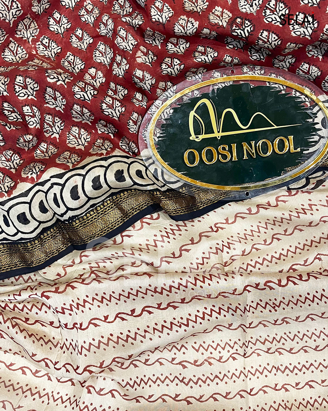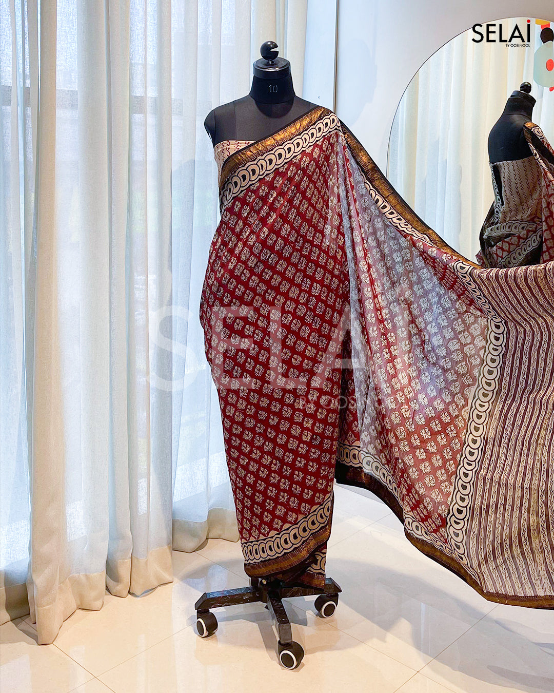A timeless blend of tradition and elegance, this rust Chanderi cotton saree is adorned with delicate handblock-inspired floral motifs and finished with a bold contrast border. Lightweight and breathable, it drapes with ease while retaining a refined sheen, making it perfect for both everyday grace and special occasions.