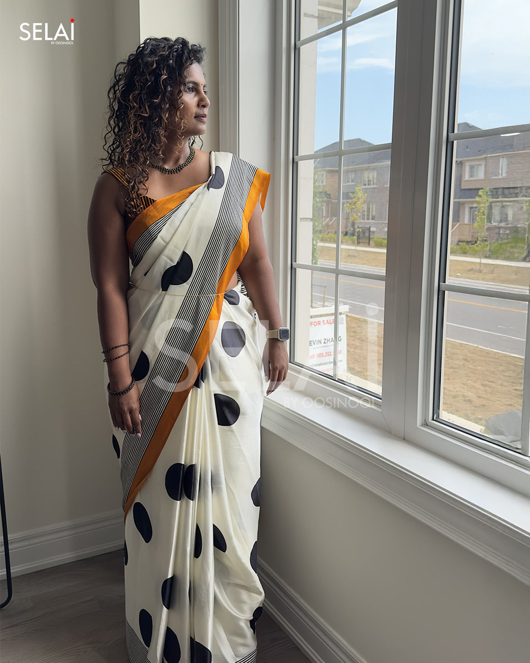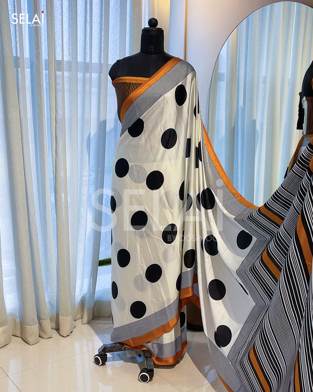 Playful yet sophisticated, this satin saree features bold black polka dots on a crisp white base, finished with a chic teal border and striped edging. The smooth, lustrous fabric drapes beautifully, making it perfect for parties, get-togethers, or a statement office look.