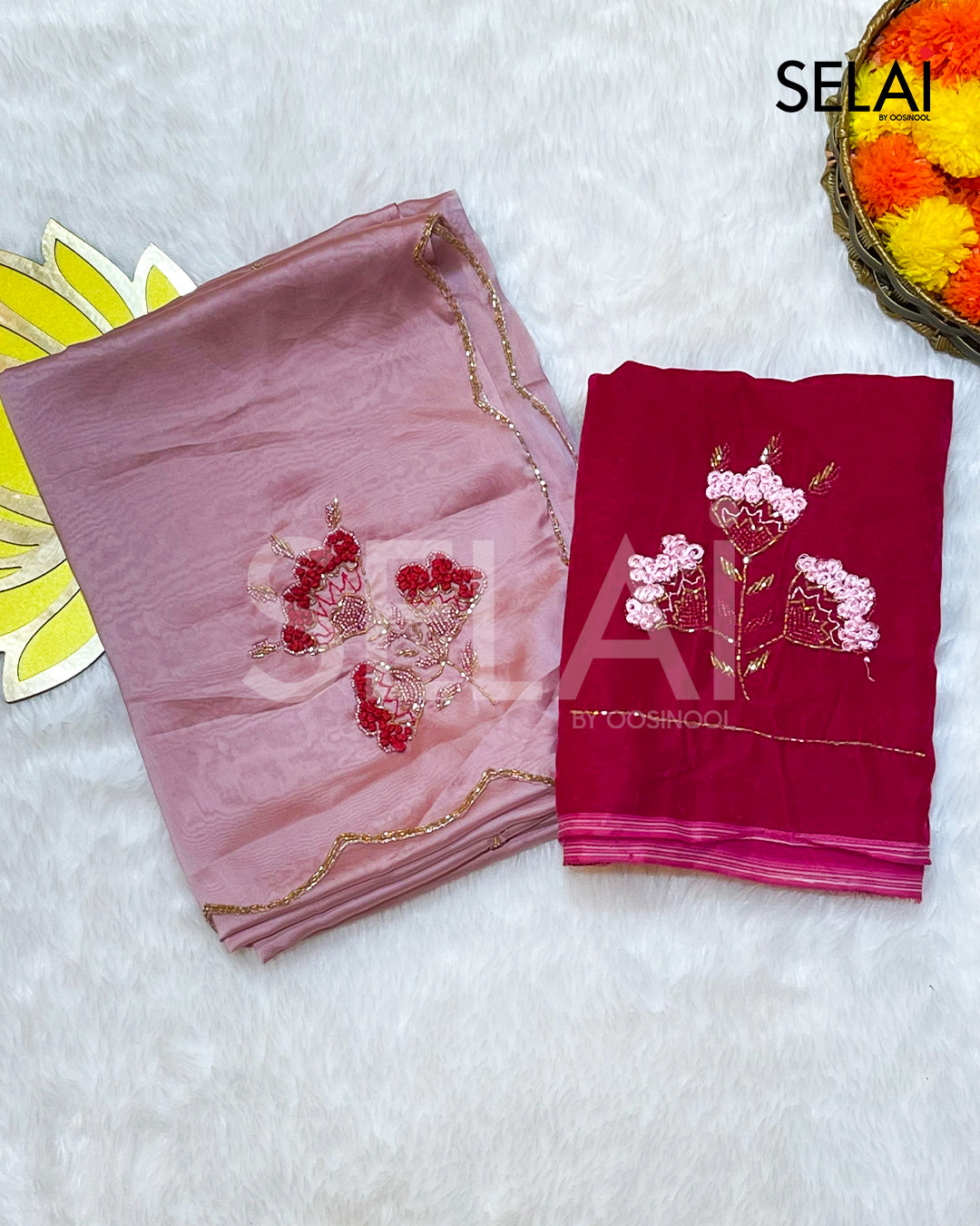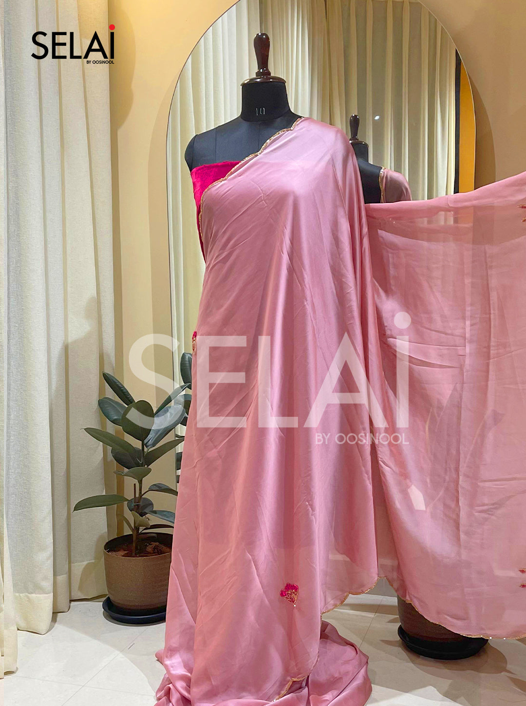 Experience the luxury of our Semi Silk Satin Saree, a masterpiece adorned with intricate cut dana beadwork. The scalloped border is highlighted with exquisite bead embellishments, while delicate floral motifs grace the corners, adding a touch of elegance. Perfect for weddings, receptions, and festive soirées, this saree effortlessly combines tradition with glamour.