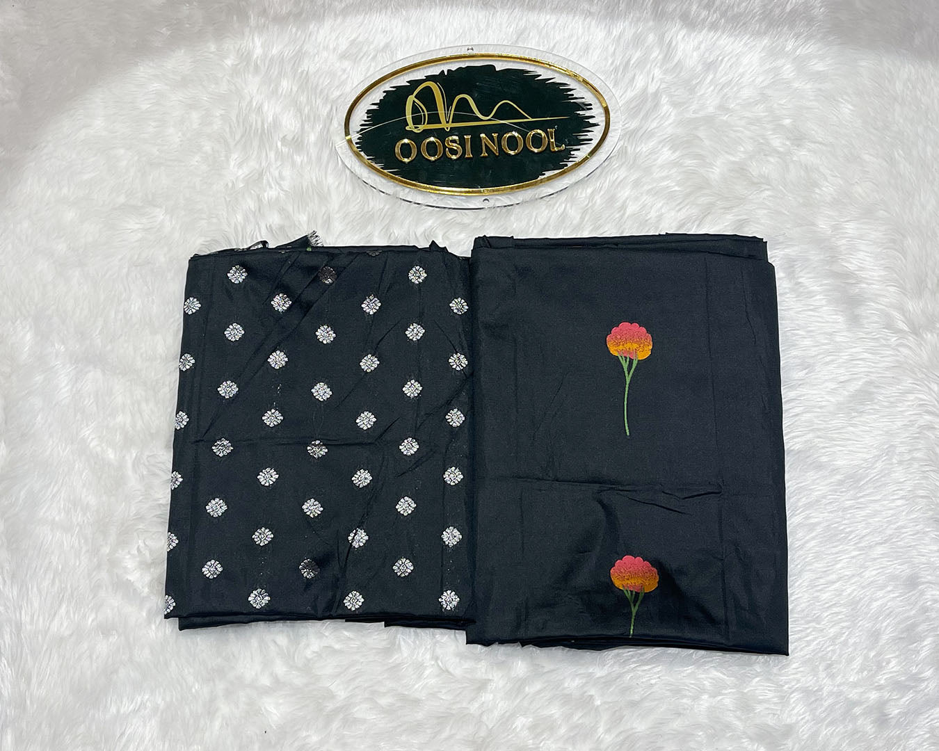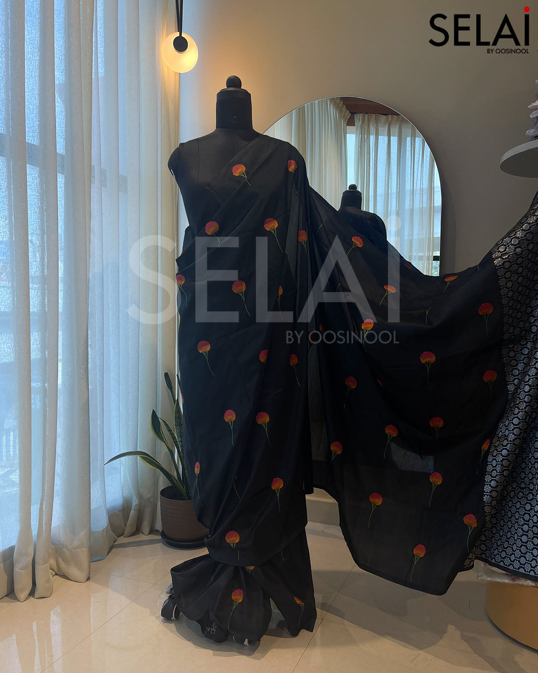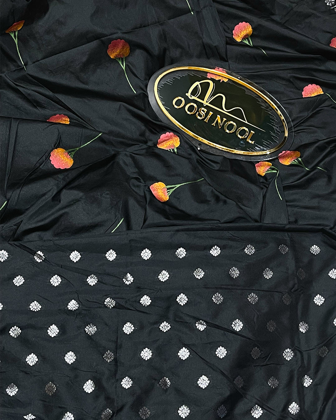 This chic black semi-silk saree is adorned with vibrant floral motifs and elegant silver zari buttas. A perfect blend of tradition and trend, it’s lightweight and easy to drape, making it an ideal choice for everyday elegance.