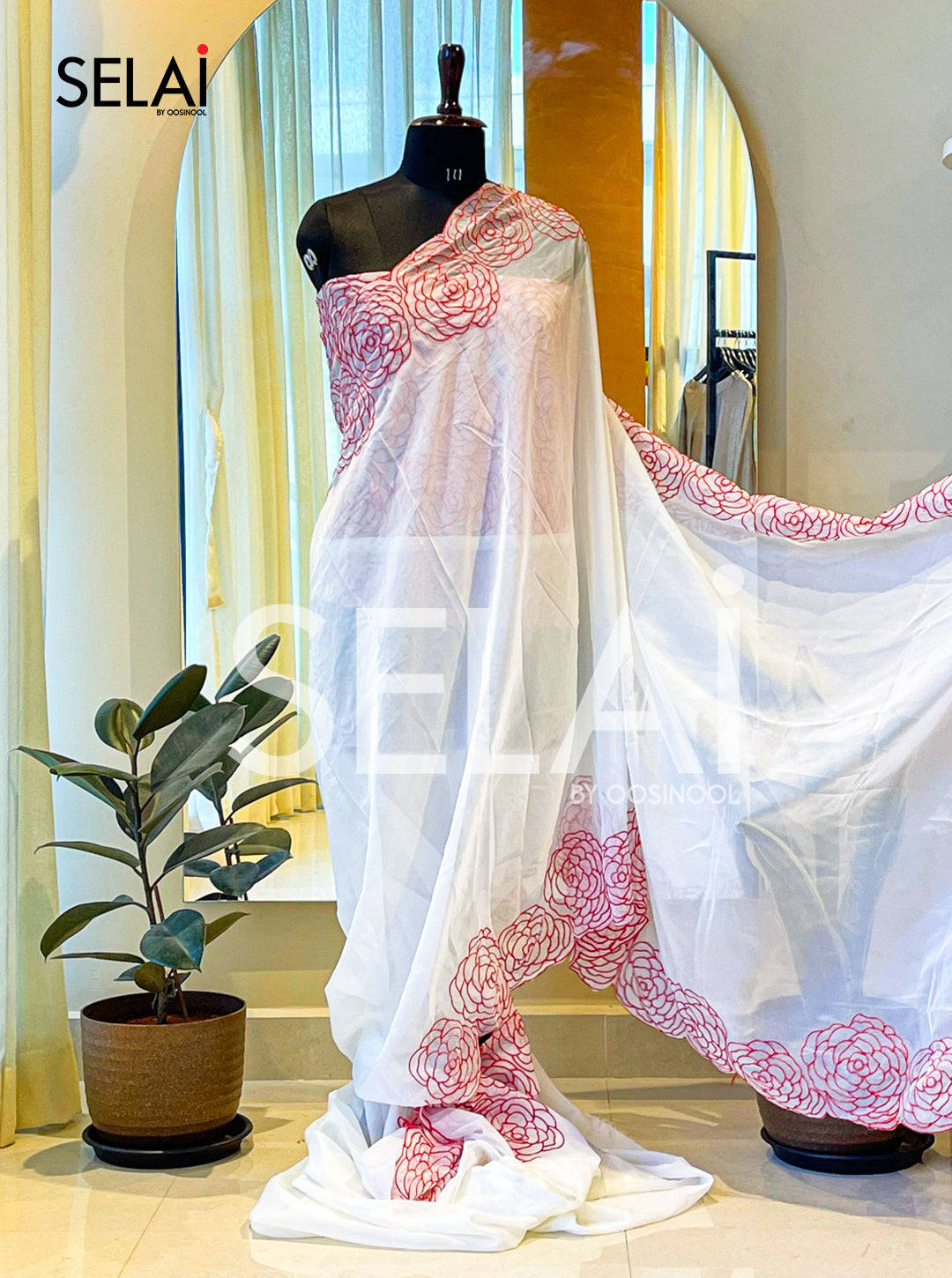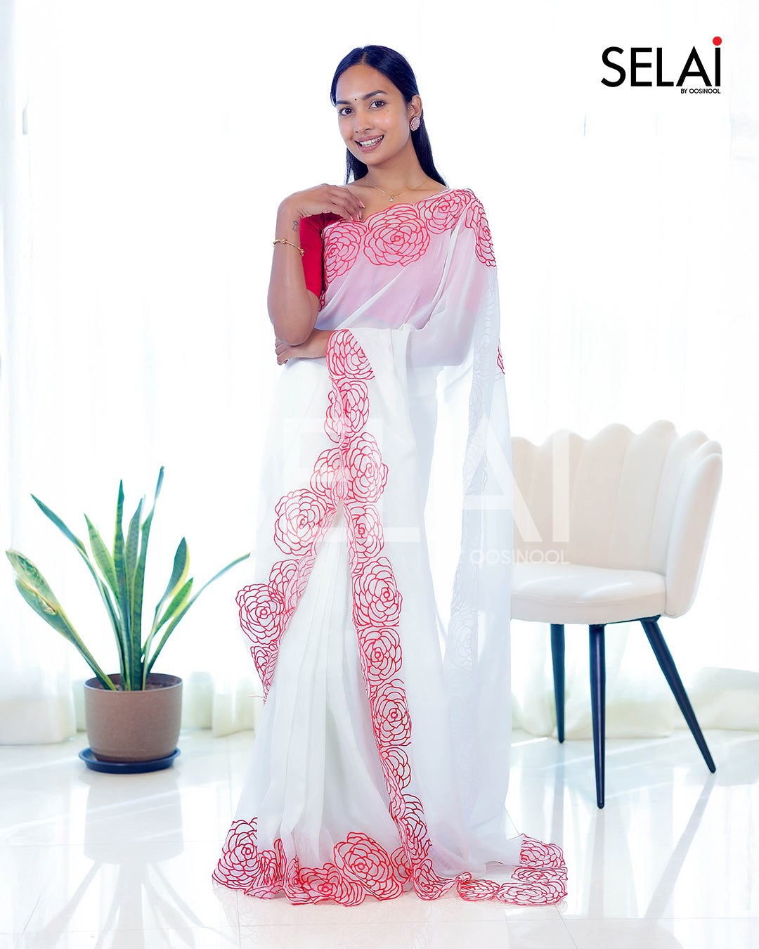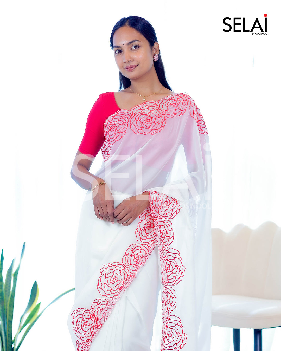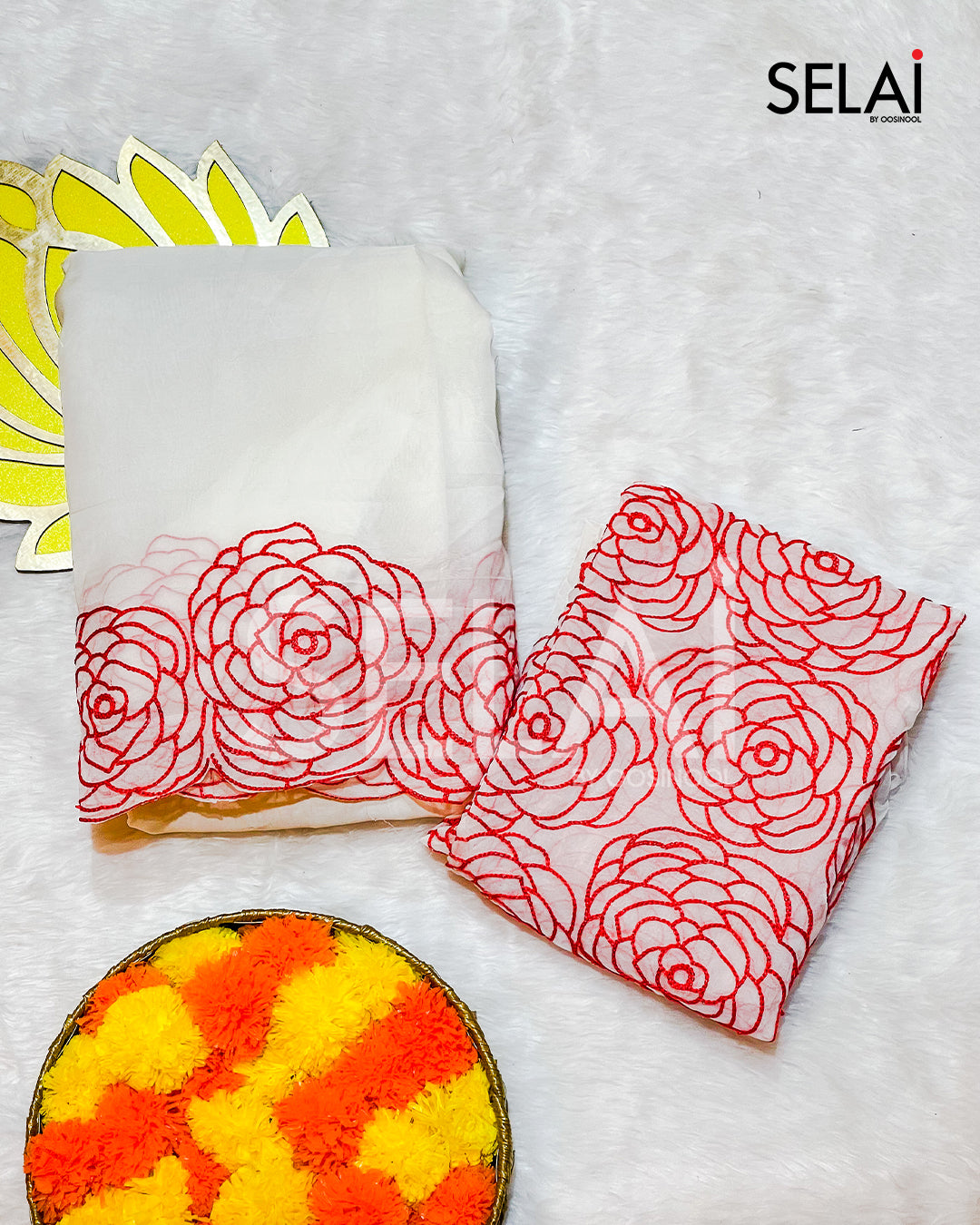 - Blouse Fabric: Soft Organza with red thread embroidery (Unstitched)