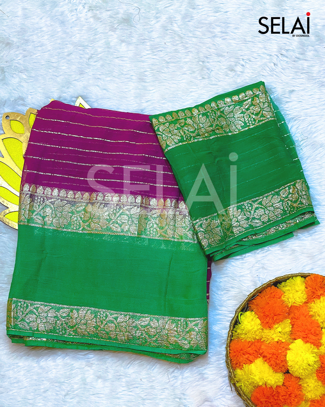 Elevate your wardrobe with this stunning viscose georgette saree, perfect for weddings, festive celebrations, and cultural gatherings. The saree features luxurious silk zari stripes across the body, beautifully complemented by a rich green contrast border with intricate zari detailing. The contrast green blouse piece completes the ensemble, offering timeless sophistication.