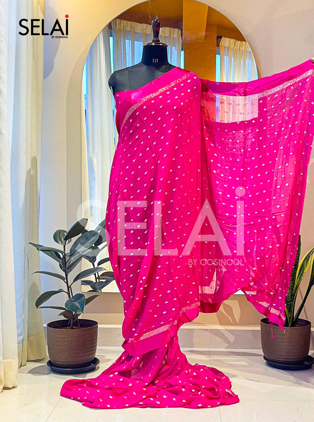 Elevate your style with our Viscose Georgette Saree, featuring delicate silk buttas and a sleek satin border finish that adds a touch of sophistication. The soft, breathable viscose georgette fabric ensures a comfortable drape, making it perfect for casual gatherings and graceful evening outings.