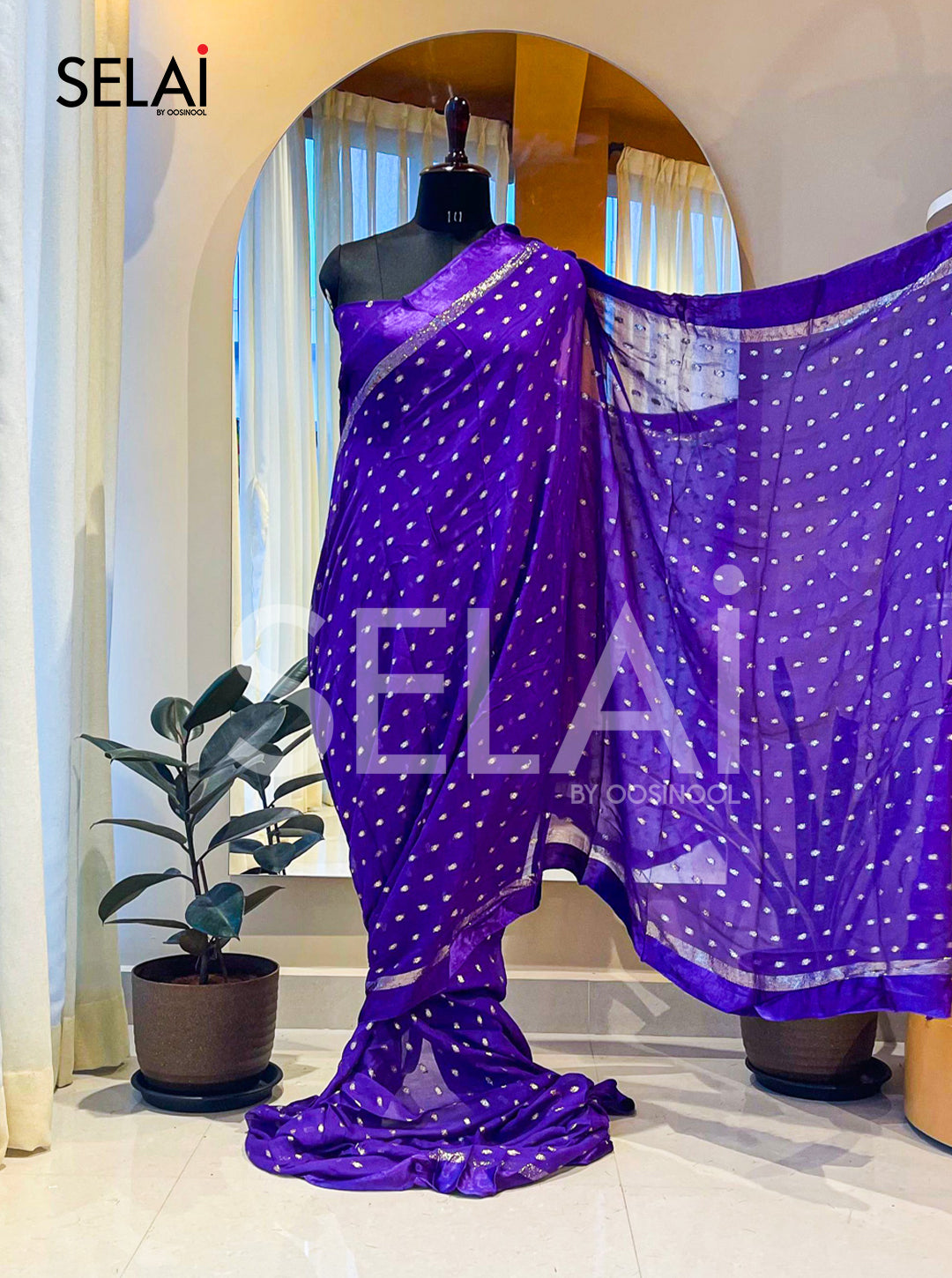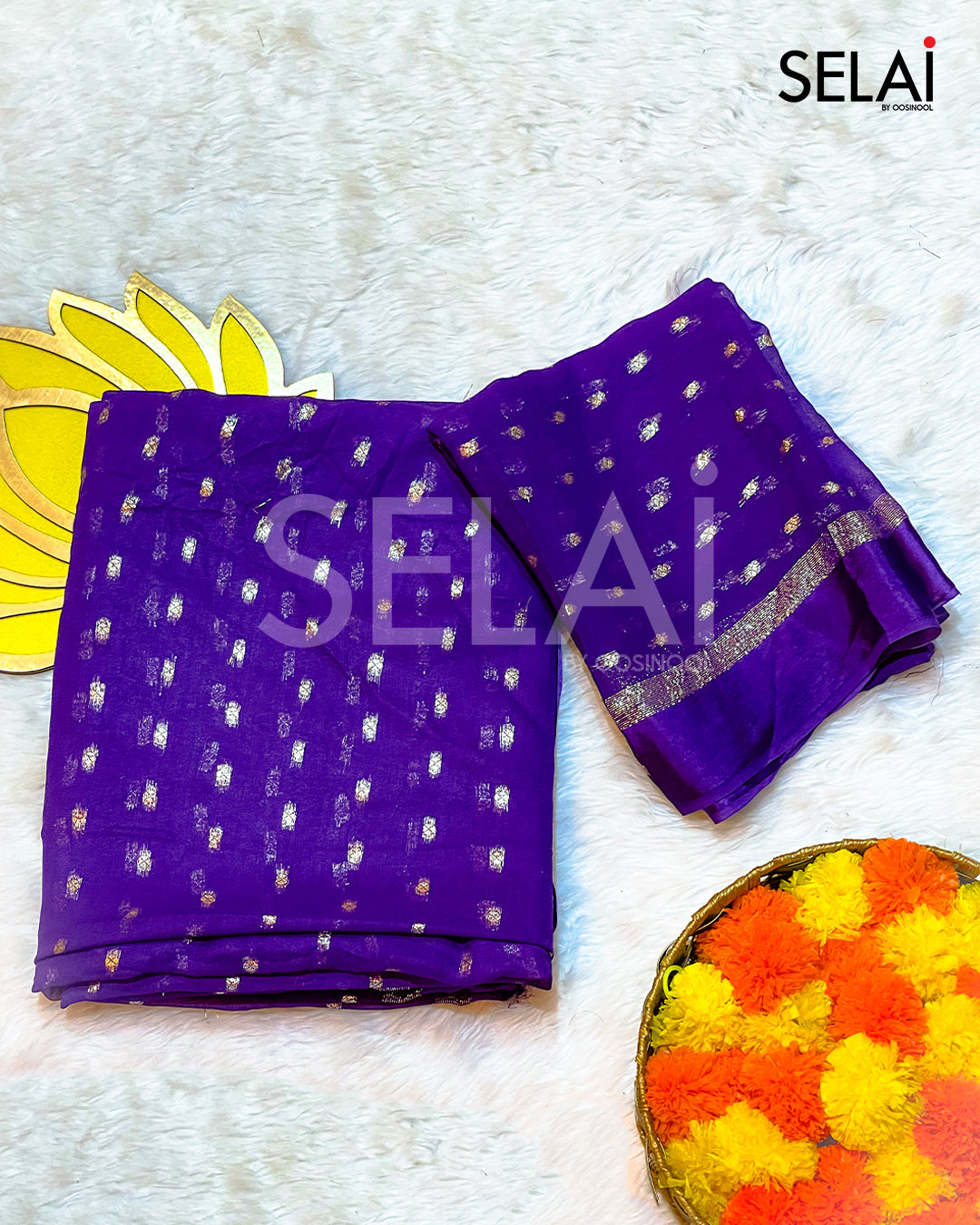 Elevate your style with our Viscose Georgette Saree, featuring delicate silk buttas and a sleek satin border finish that adds a touch of sophistication. The soft, breathable viscose georgette fabric ensures a comfortable drape, making it perfect for casual gatherings and graceful evening outings.