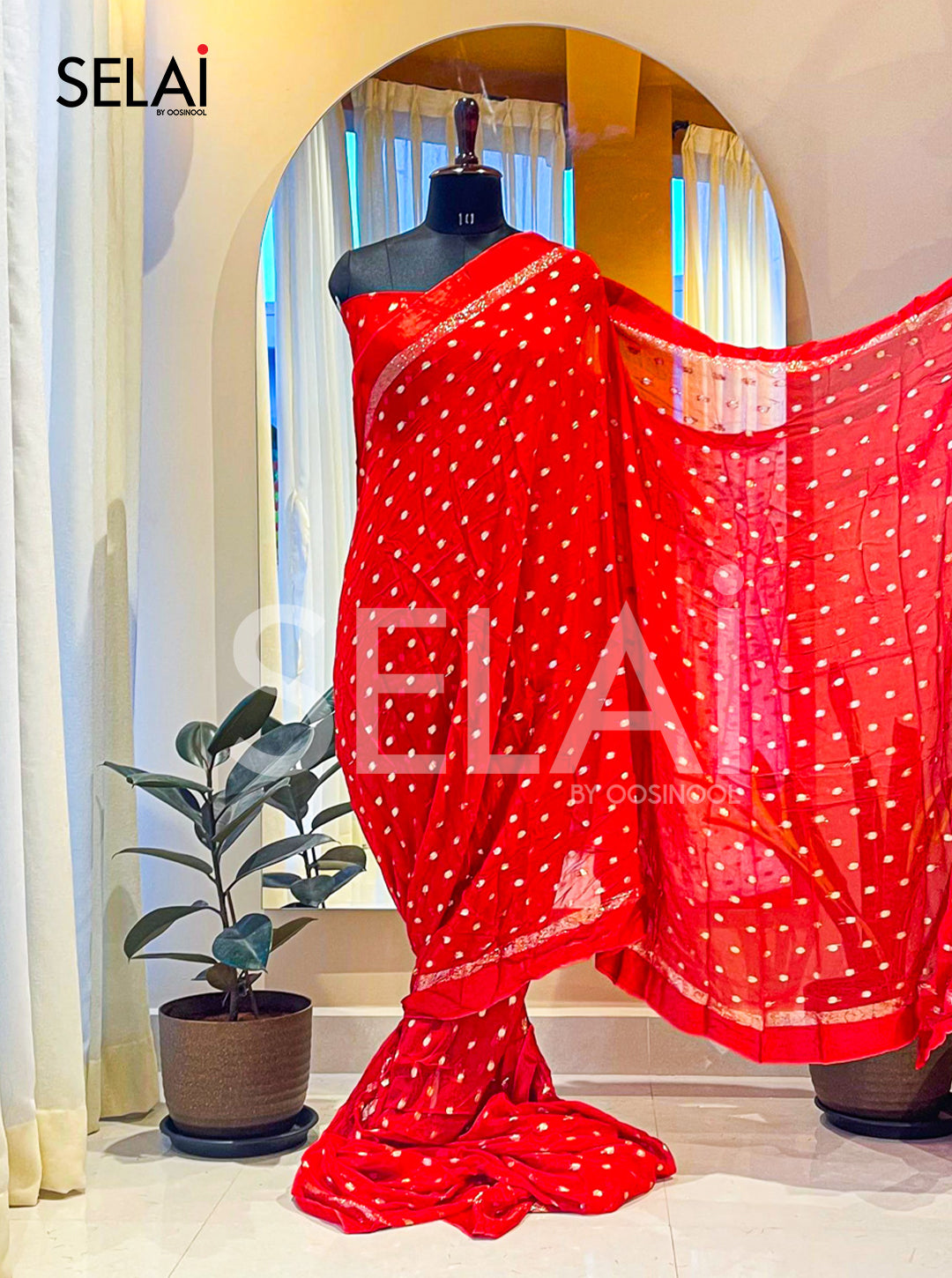 Elevate your style with our Viscose Georgette Saree, featuring delicate silk buttas and a sleek satin border finish that adds a touch of sophistication. The soft, breathable viscose georgette fabric ensures a comfortable drape, making it perfect for casual gatherings and graceful evening outings.