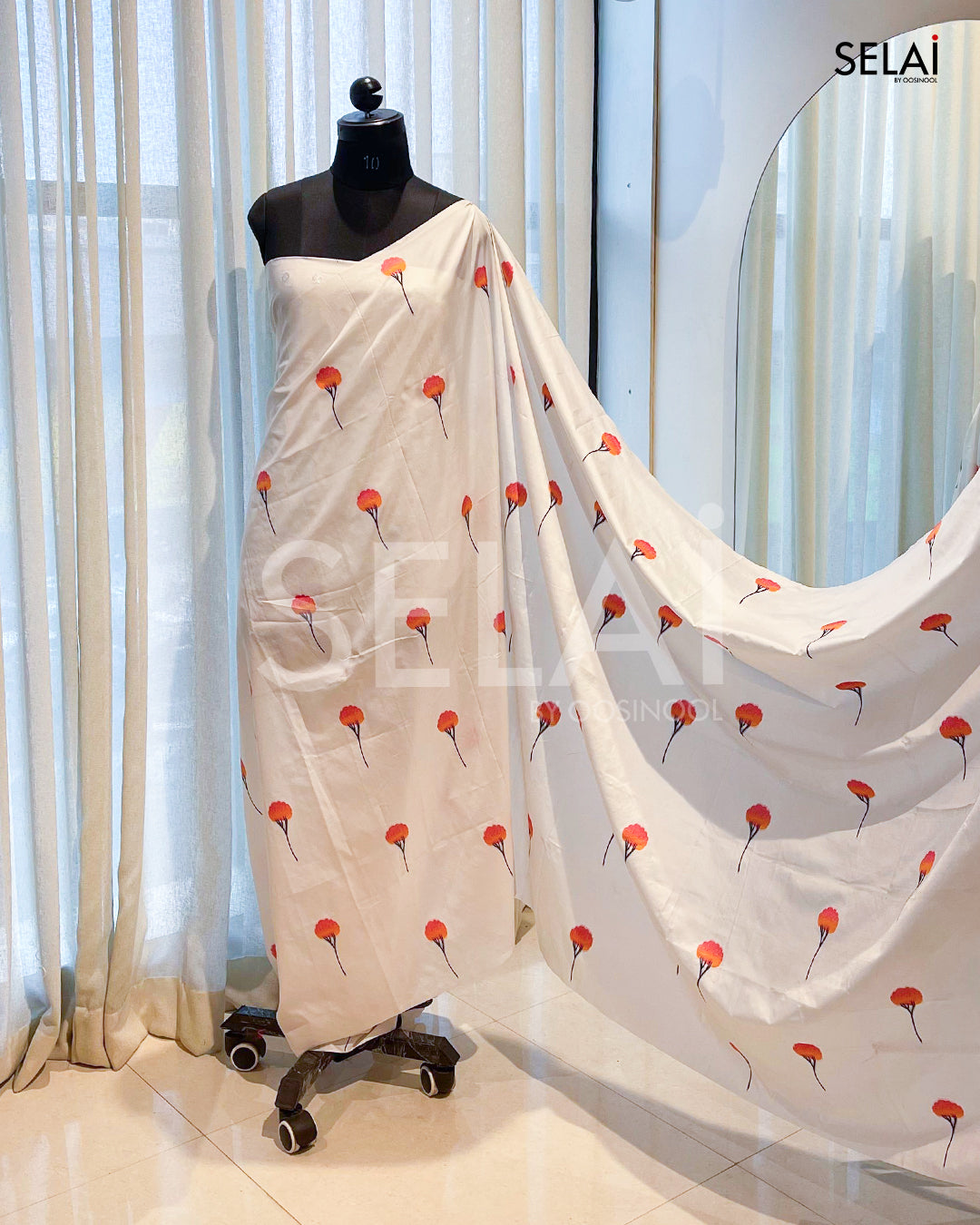 - Scattered floral motifs in orange and pink for a vibrant touch